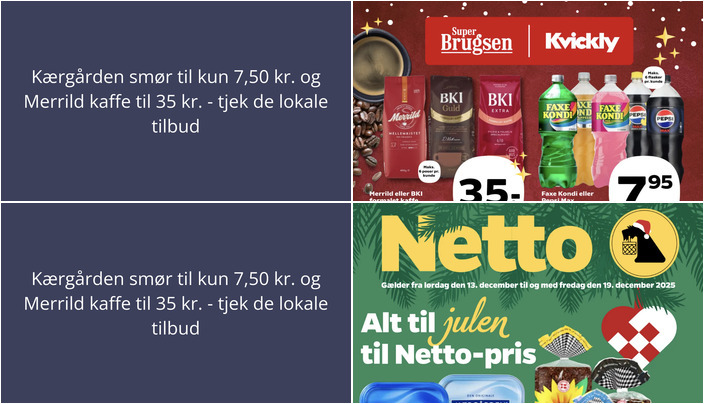 Netto tilbyder Kærgården smør i varianterne original eller let til en skarp pris på kun 7,50 kr. for 200 g. Der er en begrænsning på 6 stk. pr. variant pr. kunde pr. dag til denne pris. Tilbuddet gælder fra lørdag den 13. december til fredag den 19. december.