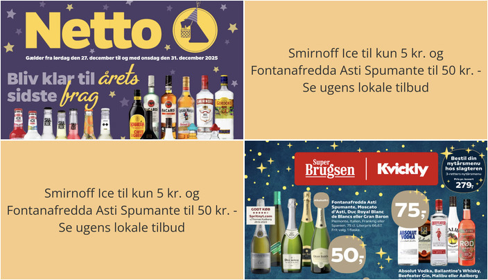 Netto tilbyder Smirnoff Ice, Shaker eller Mokai til en skarp pris på kun 5 kr. pr. 27,5 cl. Der er en begrænsning på 24 stk. pr. variant pr. kunde pr. dag. Tilbuddet gælder fra lørdag den 27. december til onsdag den 31. december.
