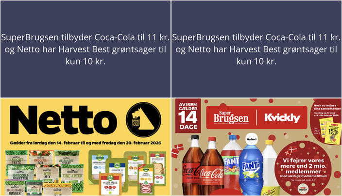 SuperBrugsen tilbyder Coca-Cola, Fanta eller Schweppes i 125-150 cl flasker til kun 11 kr. pr. flaske. Dette tilbud gælder fra fredag den 6. februar til og med torsdag den 19. februar 2026. Bemærk, at der er tale om et begrænset parti, så det er en god idé at være hurtigt ude.